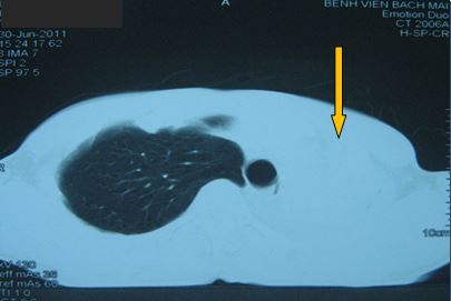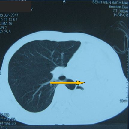 - Bệnh nhân được tiến hành chụp cắt lớp vi tính ngực (CT ngực) đánh giá: có hình ảnh tổn thương toàn bộ thùy trên phổi trái