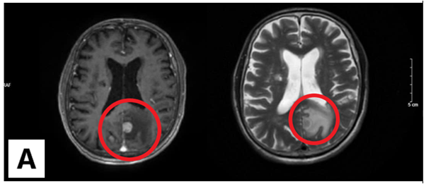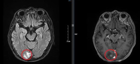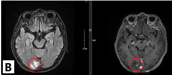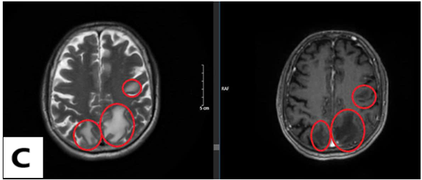 Hình 2: Hình ảnh cộng hưởng từ sọ não: Các nốt tổn thương nhu mô não ngấm thuốc mạnh sau tiêm, có phù não rộng xung quanh (vòng tròn màu đỏ)(B: Thùy chẩm, A,C: Thùy đỉnh)