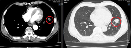 Hình 1: Hình ảnh cắt lớp vi tính lồng ngực: Phổi trái có khối tỷ trọng tổ chức kích thước 30x21mm sau tiêm ngấm thuốc (vòng trong màu đỏ)