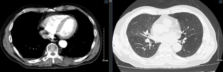 Chụp cắt lớp vi tính lồng ngực: Thùy dưới phổi trái có khối tỷ trọng tổ chức kích thước 30x21mm sau tiêm ngấm thuốc, thượng đòn phải và trung thất có vài hạch, nhóm 2, 4 lớn nhất kích thước 16x17mm, bờ rõ, ngấm thuốc sau tiêm.