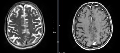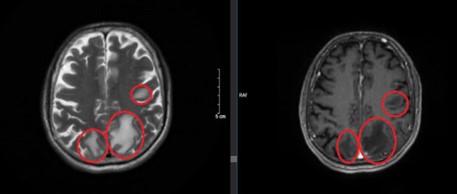 Chụp cộng hưởng từ sọ não: Nhu mô não vùng trên lều tiểu não có các nốt tổn thương nhu mô não dưới vỏ thuỳ trán trái, thùy đỉnh hai bên và thùy chẩm phải, đường kính ổ tổn thương lớn nhất 12mm, ngấm thuốc mạnh sau tiêm, có phù não rộng xung quanh.