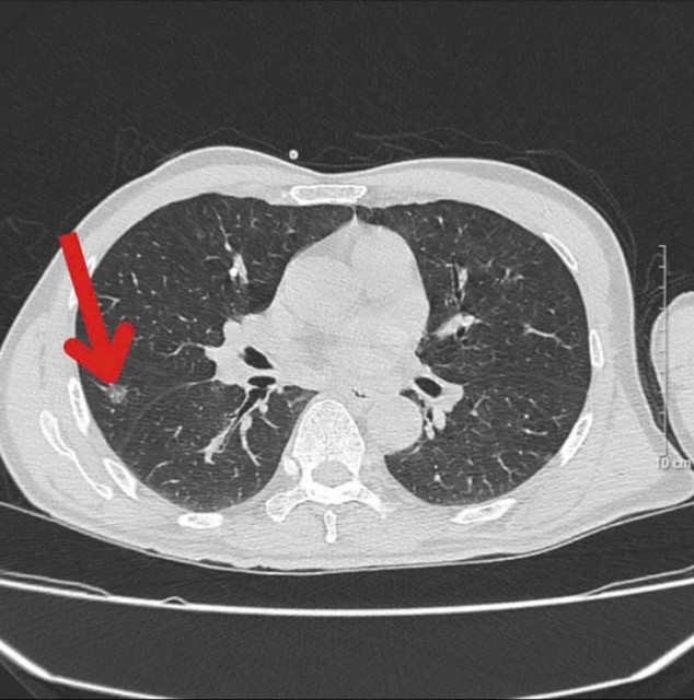 Hình 1. Hình ảnh chụp cắt lớp vi tính lồng ngực trước điều trị: Nốt bán đặc thuỳ giữa phổi phải đường kính 8,5mm (mũi tên)