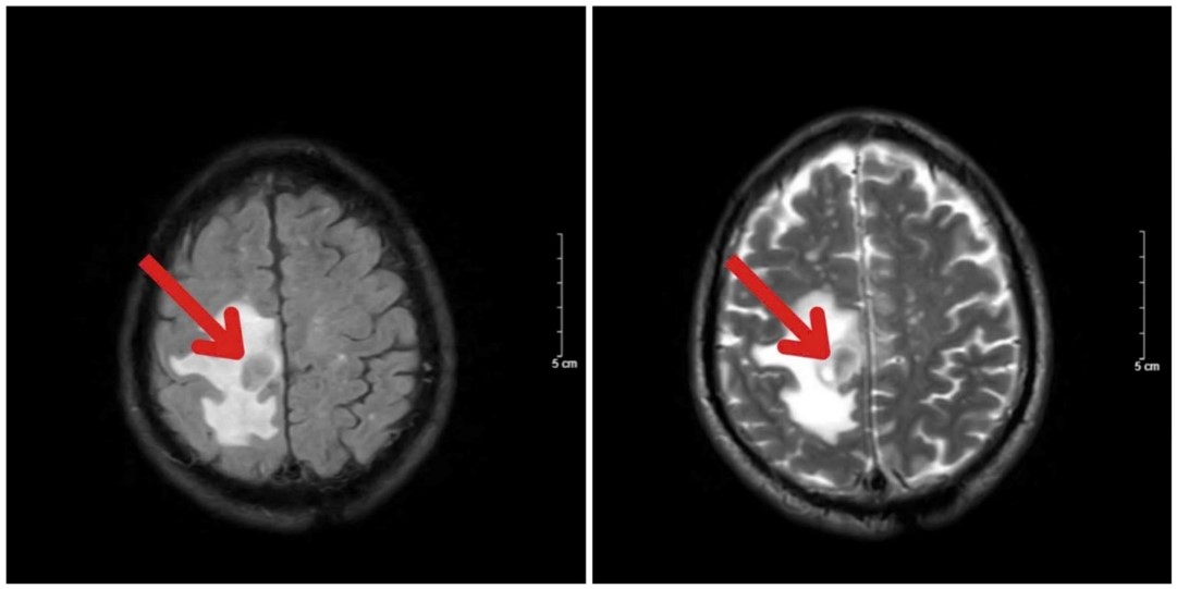 Hình 2. Hình ảnh chụp cộng hưởng từ sọ não trước điều trị: Khối u thuỳ trán phải (mũi tên đỏ) kích thước 18x18mm kèm phù não rộng xung quanh