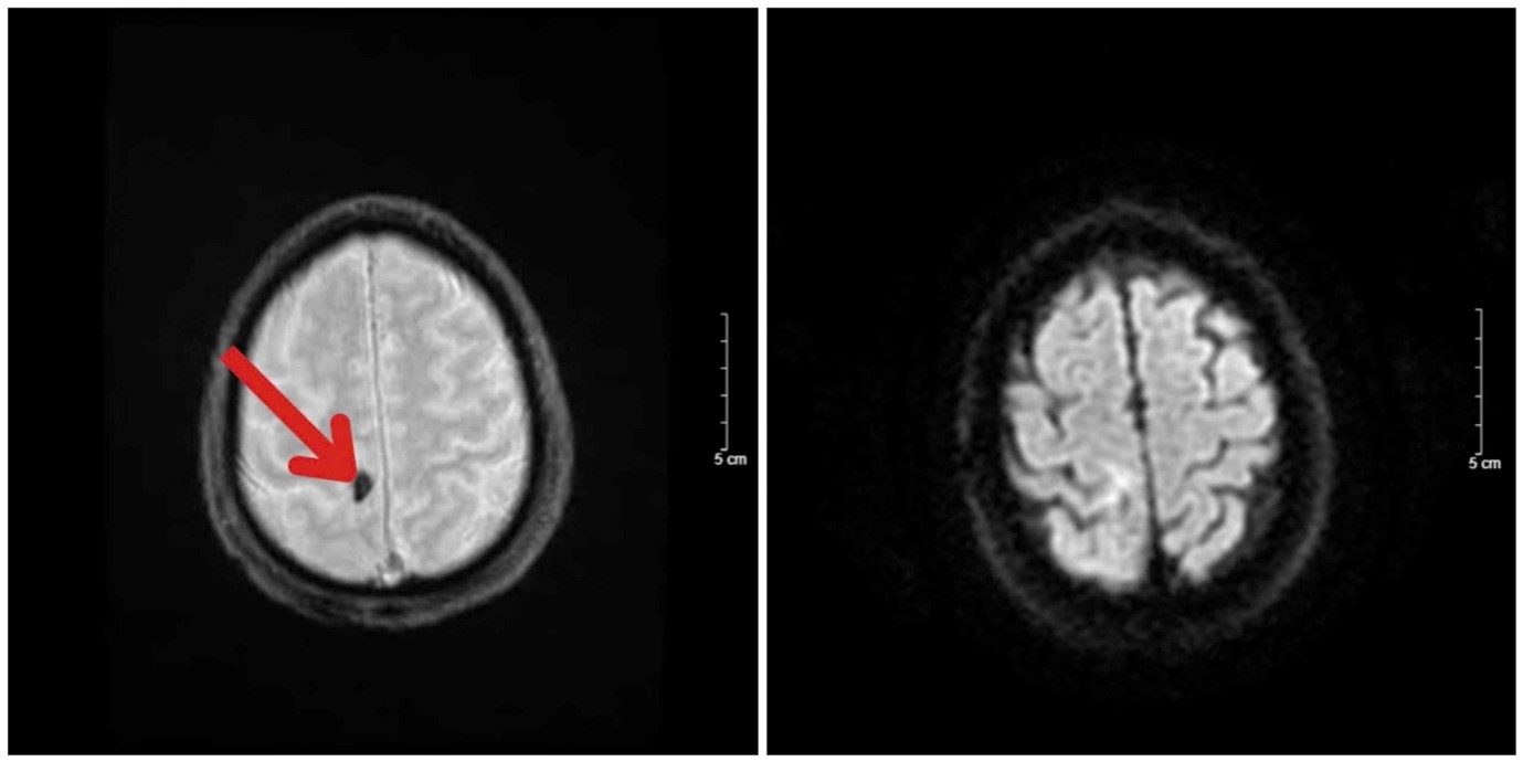 Bệnh sử: Cách vào viện 01 tháng, bệnh nhân xuất hiện yếu nửa người trái, hạn chế vận động kèm tê bì 2 tay, 2 chân, không sốt, không buồn nôn, không thất ngôn, đại tiểu tiện bình thường. Bệnh nhân đi khám tại Bệnh viện Bạch Mai được chụp cộng hưởng từ sọ não: Ổ tổn thương thuỳ trán phải kèm phù não nghĩ đến thứ phát; cắt lớp vi tính lồng ngực: Nốt bán đặc thuỳ giữa phổi phải.