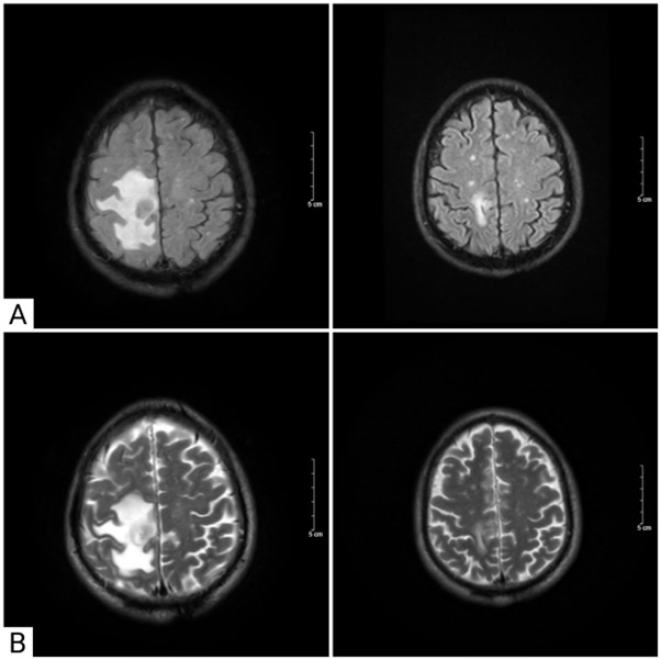 A. Hình ảnh chụp cộng hưởng từ sọ não trên chuỗi xung FLAIR: Khối u thuỳ trán phải giảm kích thước từ 18x18mm xuống còn 8x10mm