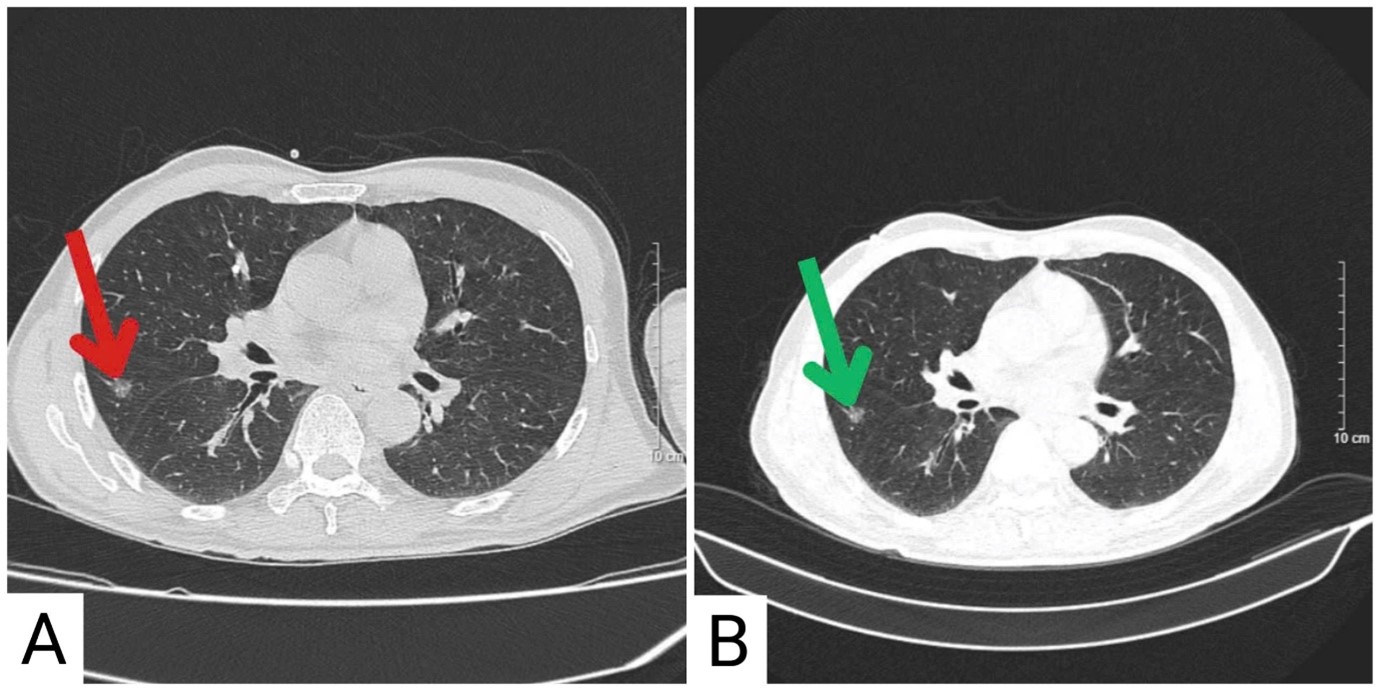 B. Hình ảnh chụp cắt lớp vi tính lồng ngực sau điều trị: Nốt đặc thuỳ dưới phổi trái (mũi tên xanh lá cây) kích thước 9mm (không tăng so với trước điều trị), không xuất hiện thêm tổn thương thứ phát.