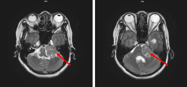 Bệnh biểu hiện từ tháng 11/2023 với triệu chứng đau đầu âm ỉ, chóng mặt, buồn nôn, không nôn, nghe kém, không yếu liệt, điều trị tại y tế cơ sở triệu chứng không giảm. Đi khám tại Bệnh viện Bạch Mai được chẩn đoán U góc cầu tiểu não trái, đã được phẫu thuật lấy u tại Khoa Phẫu thuật Thần kinh tháng 12/2023, Giải phẫu bệnh: Schwannoma. Sau mổ bệnh nhân ổn định. Chuyển Trung tâm Y học hạt nhân và Ung bướu khám và điều trị tiếp.