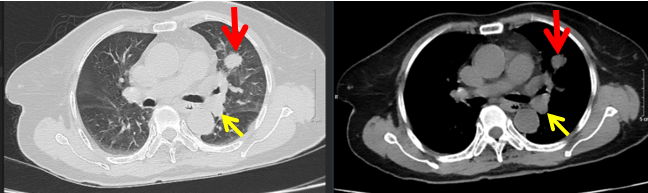 Hình 1: Hình ảnh chụp cắt lớp vi tính ngực: U thùy trên phổi trái kích thước 36x28mm (mũi tên màu đỏ), hạch rốn phổi trái (mũi tên màu vàng).