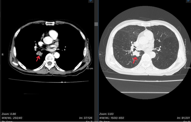 Hình 1: Hình ảnh chụp cắt lớp vi tính lồng ngực cho thấy nhu mô thùy dưới phổi có khối kích thước 26x20mm, bờ không đều, sau tiêm ngấm thuốc. Hạch trung thất. Giãn phế nang hai phổi. Dải xẹp mành nhu mô thùy giữa phổi phải
