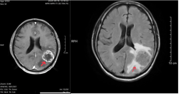 - Hình 2: Hình ảnh cộng hưởng từ não cho thấy nhu mô bán cầu tiểu não trái, thùy thái dương trái, thùy đỉnh trái có các nốt và khối, khối lớn kích thước 35x36mm, tín hiệu tổ chức, bờ không đều, ngấm thuốc viền sau tiêm, phù não xung quanh.