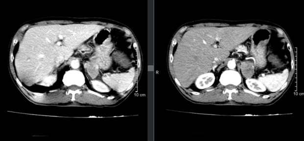 - Hình 3: Hình ảnh cắt lớp vi tính ổ bụng cho thấy có khối ngấm thuốc tuyến thượng thận trái kích thước 44x30mm - theo dõi thứ phát.