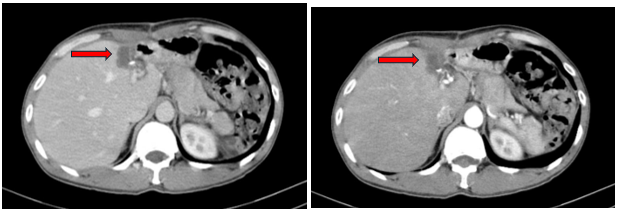 Hình 1: Trên hình ảnh CT ổ bụng cho thấy nhu mô gan trái có khối lớn, kích thước khoảng 92x70mm, tỉ trọng hỗn hợp trước tiêm, sau tiêm ngấm thuốc không đồng nhất, có phần ngấm thuốc mạnh thì động mạch, thải thuốc thì tĩnh mạch và thì muộn, tăng sinh mạch trong khối. Khối đẩy lồi bao gan, không thấy thâm nhiễm xung quanh hay hay to lân cận, theo dõi HCC