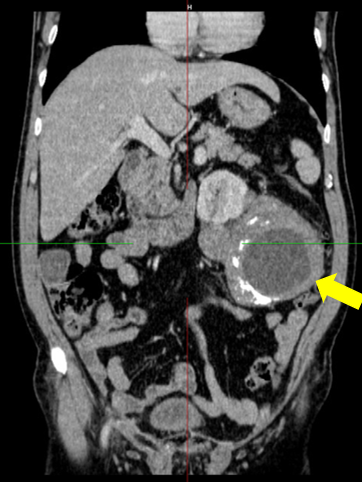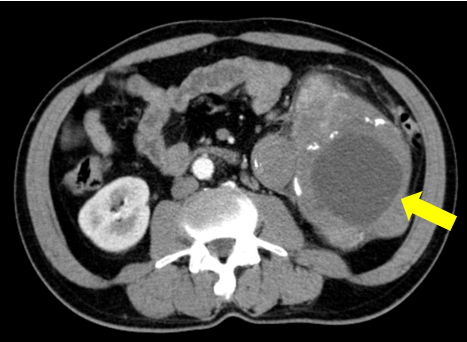 Hình 1: Hình ảnh chụp cắt lớp vi tính bụng: u vùng mạn sườn trái có tổn thương tỷ trọng hỗn hợp kèm vài nốt vôi hóa rải rác, thâm nhiễm xung quanh (mũi tên vàng).