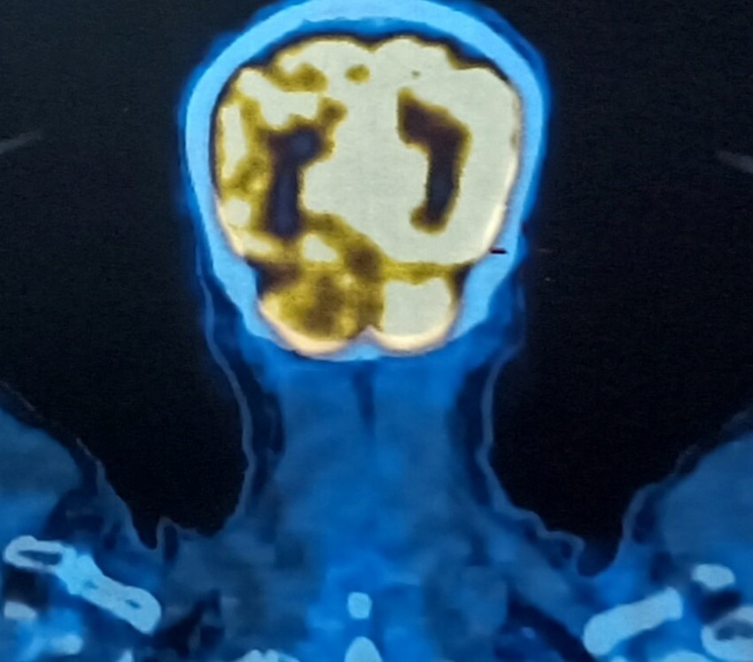 Hình 7: Hình ảnh chụp PET/CT: Không thấy hình ảnh tăng chuyển hóa FDG tại vùng thái dương chẩm trái (vị trí đã phẫu thuật ung thư hắc tố ác tính).