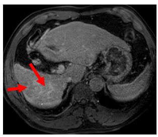 Hình 1: Hình ảnh chụp cộng hưởng từ ổ bụng tháng 8/2020: Hình ảnh hai nốt khu trú kích thước 35x36mm và 14x15mm, vị trí gan phải tính chất động học HCC (mũi tên đỏ).