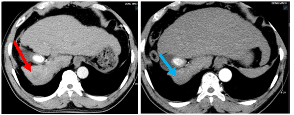 Hình 2: Hình ảnh chụp cắt lớp vi tính ổ bụng tháng 1/2021 (bên trái) và tháng 4/2022 (bên phải): Hình ảnh u gan phải sau điều trị kích thước 18x22 mm, còn tăng sinh mạch (mũi tên đỏ). Hình ảnh u gan phải sau điều trị kích thước 18x22 mm, không còn tăng sinh mạch (mũi tên xanh).