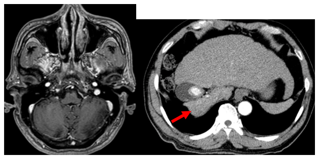 Hình 3: Hình ảnh cộng hưởng từ sọ (bên trái) và cắt lớp vi tính ổ bụng (bên phải) tháng 9/2022: Chưa phát hiện hình ảnh tổn thương (hình bên trái). Hình ảnh u gan phải sau điều trị kích thước 17x13mm, không tăng sinh mạch (mũi tên đỏ).