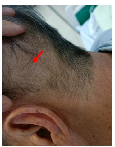 Hình 4: Hình ảnh sẹo mổ cũ vùng da đầu thái dương chẩm bên trái do phẫu thuật ung thư hắc tố ác tính kích thước khoảng 6 cm (mũi tên đỏ).