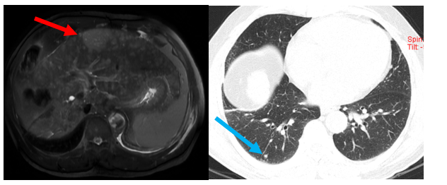 Hình 5: Hình ảnh chụp cộng hưởng từ ổ bụng (bên trái) và hình ảnh chụp cắt lớp vi tính ngực (bên phải) (Tháng 3/2024): Hình ảnh u gan đa ổ ở hạ phân thùy III, khối lớn nhất có kích thước 45x58mm, không rõ tính chất HCC (mũi tên đỏ). Hình ảnh nốt đặc nhỏ thùy dưới phổi phải kích thước 6 mm (mũi tên xanh).