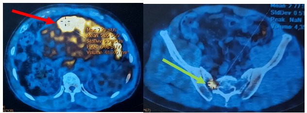 Hình 6: Hình ảnh chụp PET/CT: Hình ảnh khối ở gan hạ phân thùy III kích thước 36x66x71mm, tăng chuyển hóa FDG (SUV max= 7,3) (bình thường nhỏ hơn 2,5) (mũi tên đỏ) (FDG là một dược chất phóng xạ dùng trong chụp cắt lớp ghi hình positron, SUV max là giá trị hấp thu tiểu chuẩn tối đa FDG, tăng cao chuyển hóa FDG hướng tới gợi ý tổn thương ác tính). Không phát hiện hình ảnh tăng chuyển hóa FDG tại vị trí gan phải (tổn thương u gan cũ đã SIRT). Hình ảnh tăng chuyển hóa FDG tại cánh xương cùng, nghĩ đến do di căn (SUV max= 4,5) (mũi tên xanh).