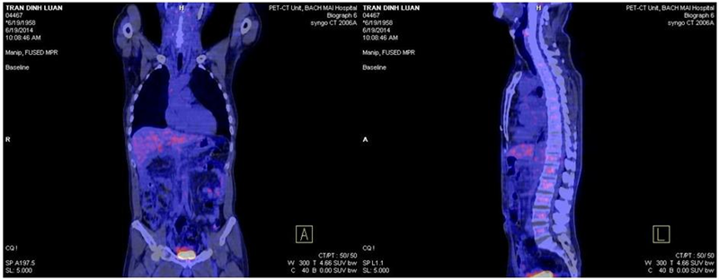 Bệnh nhân được chỉ định chụp PET/CT đánh giá sau điều trị: Kết quả không thấy hình ảnh tăng hấp thu và chuyển hóa F–18FDG bất thường trong cơ thể.