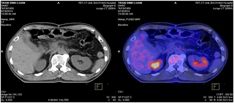 Bệnh sử: Bệnh diễn biến 2 tháng trước vào viện. Bệnh nhân xuất hiện vàng da, vàng mắt tăng dần, kèm theo mệt mỏi, gầy sút 4 kg/1 tháng. Bệnh nhân đã đi khám và được chẩn đoán Ung thư bóng Vater tại bệnh viện Bạch Mai. Sau đó bệnh nhân được phẫu thuật cắt khối tá tụy tại Bệnh viện Việt Đức. Hiện tại, sau mổ ngày thứ 20 bệnh nhân ổn định được chuyển điều trị tại Trung tâm Y học hạt nhân và ung bướu Bệnh viện Bạch Mai.