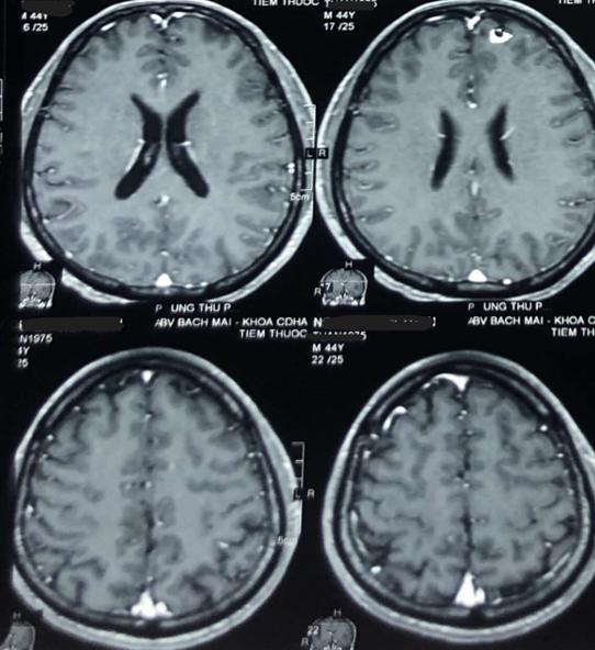 Bệnh sử: Năm 2019, khởi phát bệnh nhân biểu hiện mệt mỏi, đau tức ngực, khó thở, ho khạc ra máu, kèm yếu liệt tay trái, chân trái, không gầy sút cân, đi khám tại Trung tâm Y học hạt nhân và Ung bướu - Bệnh viện Bạch Mai, chẩn đoán ung thư phổi di căn não.