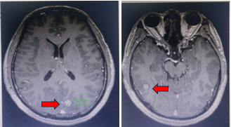 Hình 1: Hình ảnh chụp MRI sọ não: Nhiều nốt ngấm thuốc mạnh rải rác ở nhu mô não trên và dưới lều, theo dõi tổn thương thứ phát (mũi tên đỏ).