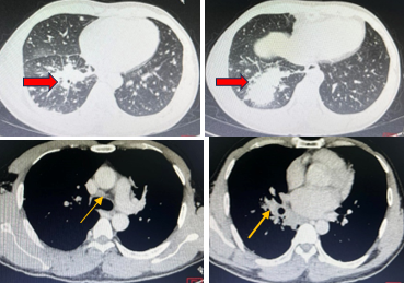 Hình 3: Hình ảnh khối u thuỳ dưới Phổi phải, kích thước 70×75 mm (mũi tên đỏ) nhiều tổn thương thứ phát 2 phổi, hạch trung thất và rốn phổi phải (mũi tên vàng)