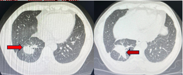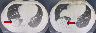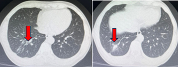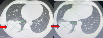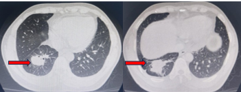 Hình 4:Hình ảnh khối u thùy dưới phổi Phải giảm kích thước đáng kể sau điều trị (mũi tên)