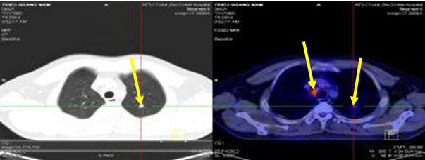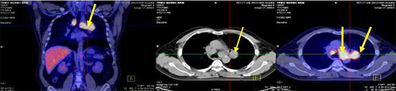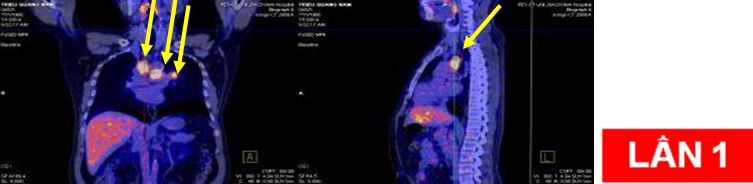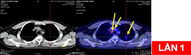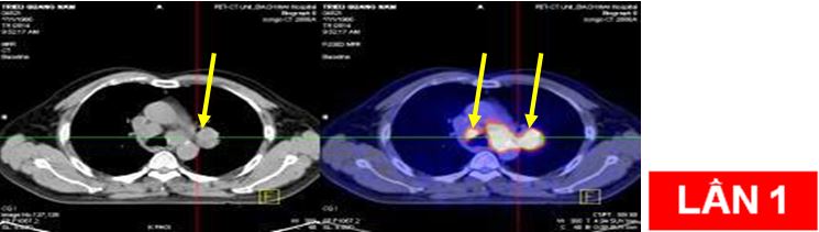Di căn hạch trung thất tăng hấp thu FDG, nốt mờ thùy trên phổi trái tăng hấp thu FDG