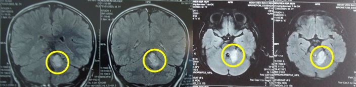 Trên phim chụp cộng hưởng từ (MRI) sọ não: thấy có khối tổn thương ở vị trí xung quanh củ xám, kích thước khối u 3,2 x 2,8cm, đồng tín hiệu trên T1, tăng tín hiệu T2, không ngấm thuốc sau tiêm.