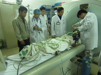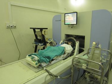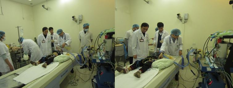 Hình ảnh gây mê nội khí quản cho bệnh nhân, ngay tại phòng xạ phẫu-Trung tâm Y học hạt nhân và Ung bướu, bệnh viện Bạch Mai