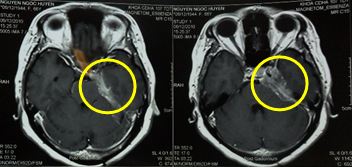 Hình 1: Hình ảnh u màng não trên phim chụp MRI, trước điều trị: U có kích thước 3x 5 cm, chèn ép động mạch cảnh trong. Bệnh nhân bị đau nửa mặt trái, giảm thị lực mắt trái. |