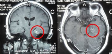 Tại đây bệnh nhân đã được khám lâm sàng và làm các xét nghiện chẩn đoán. Kết quả chụp cộng hưởng từ sọ não, cho thấy hình ảnh của u màng não vùng xương bướm, chèn ép vào động mạch cảnh trong trái và các dây thần kinh vận động nhãn cầu bên trái và thần kinh thị giác bên trái.