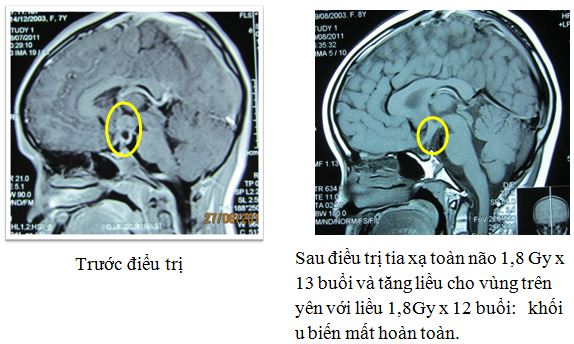 Bệnh nhân tiếp tục được chỉ định tia xạ tăng liều cao hơn vào vùng trên yên ( vị trí khối u) thêm 12 buổi x 1,8Gy để đạt tổng liều vào khối u là 45Gy. Đánh giá sau điều trị bệnh đáp ứng rất tốt không có tác dụng phụ nhiều.