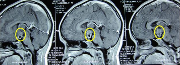 Hình ảnh Cộng hưởng từ (MRI) u vùng trên yên ngấm thuốc nhiều nghĩ tới Germinoma (u tế bào mầm tinh) (trước điểu trị) |