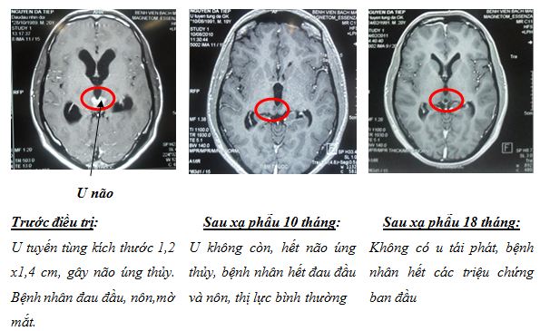 Sau 1 tháng điều trị các triệu chứng lâm sàng cải thiện dần dần, sau 3 tháng bệnh nhân khỏi hết hẳn các triệu chứng đau đầu, buồn nôn.... Kết quả chụp MRI não không còn u não, hết não úng thủy. Bệnh nhân được tái khám định kỳ 3 tháng một lần và kết quả không thấy u tái phát. Sau điều trị bệnh nhân học tập bình thường.