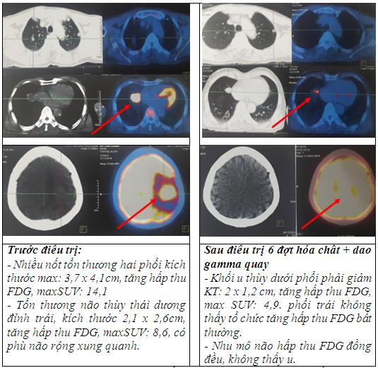 - Chụp PET/CT đánh giá lại sau điều trị 6 chu kỳ hoá trị: Khối u thùy dưới phổi phải giảm KT: 2x1,2cm, tăng hấp thu FDG, max SUV: 4,9. phổi trái không thấy tổ chức tăng hấp thu FDG bất thường. Nhu mô não hấp thu FDG đồng đều, không thấy u.