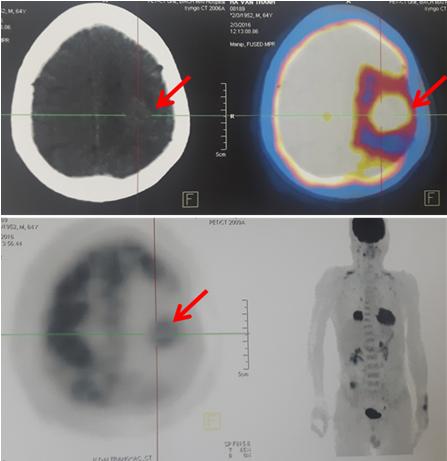 Cách ngày vào viện 2 tuần bệnh nhân cảm thấy đau đầu kèm theo yếu nửa người phải tăng dần, đi khám được chụp cắt lớp vi tính sọ não, phát hiện thấy tổn thương u vùng thùy đỉnh não trái. Bệnh nhân xin chuyển đến trung tâm Y học hạt nhân và Ung bướu – Bệnh viện Bạch Mai để chẩn đoán và điều trị.