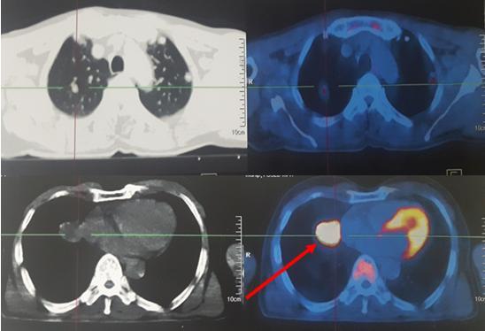 Khối u thùy dưới phổi phải giảm KT: 2x1,2cm, tăng hấp thu FDG, max SUV: 4,9. phổi trái không thấy tổ chức tăng hấp thu FDG bất thường.