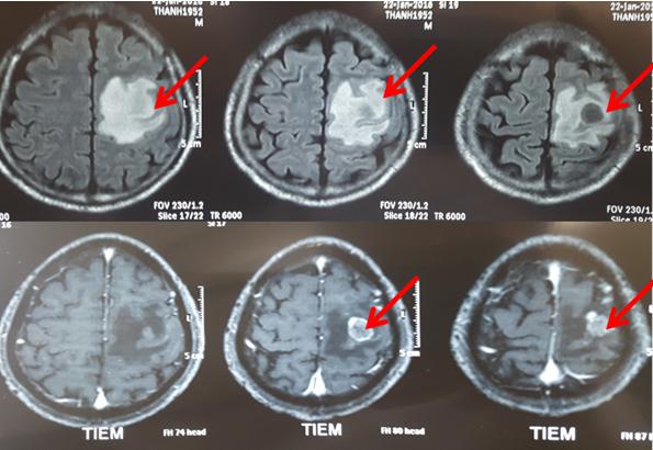 - Chụp cộng hưởng từ sọ não: Thấy tổn thương não dạng u di căn tại thùy đỉnh thái dương trái kích thước 2,1x2cm, ngấm thuốc mạnh, phù não rộng xung quanh.