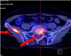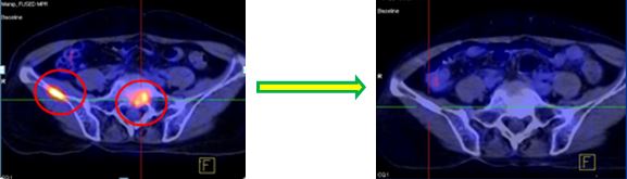 Trước điều trị: - Đau xương chậu nhiều - Tổn thương xương cánh chậu phải max SUV=5,34 - Tổn thương xương cùng S1, Max SUV=4,4 | Sau điều trị: - Không đau xương - Không còn tổn thương di căn xương