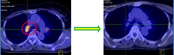 Trước điều trị: U phế quản gốc phải, kích thước: 1,6x2,9cm, Max SUV=5,76 | Sau điều trị: U tan hết, không còn tổ chức tăng hấp thu FDG |