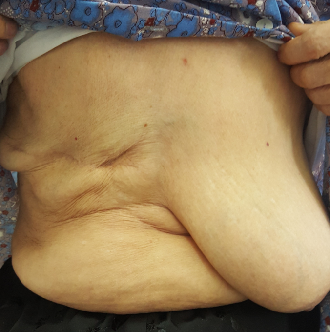 Vú bên phải đã phẫu thuật cắt toàn bộ, vú bên trái không sờ thấy u, sẹo mổ trước ngực bên phải co kéo.
