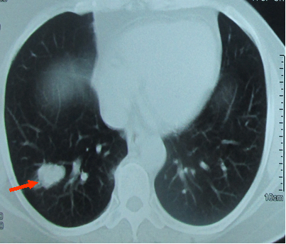 Hình 1: Hình chụp CT lồng ngực cho thấy u phổi phải dạng di căn, kích thước (1,8x2)cm ngấm thuốc mạnh sau tiêm