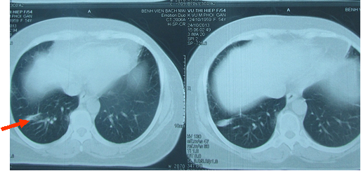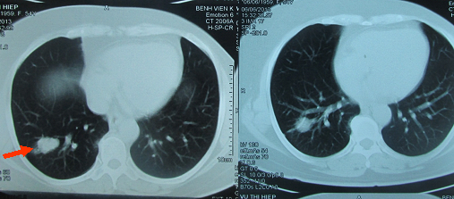- CT scanner phổi, nốt di căn phổi phải kích thước (1,8x2)cm (hình 1).