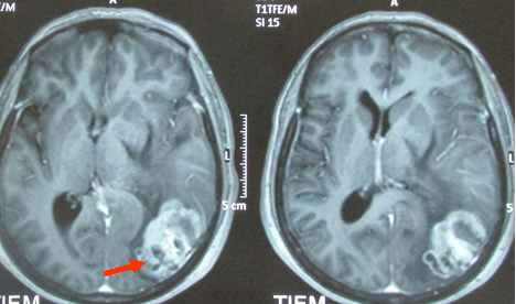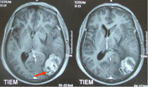 Hình 2: Hình ảnh chụp MRI sọ não cho thấy khối u vùng chẩm trái, kích thước (3,5x5)cm ngấm thuốc sau tiêm,có phù não xung quanh.