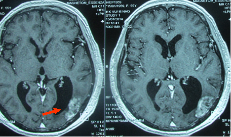 - MRI sọ não cho thấy khối u vùng chẩm trái kích thước (3,5x5)cm ngấm thuốc sau tiêm, có phù não xung quanh (hình 2).