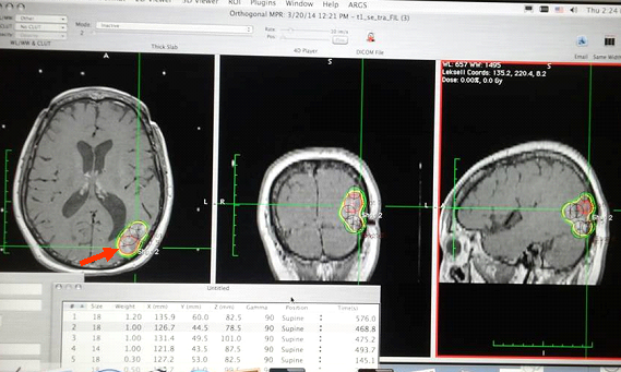 Bệnh nhân đã được tạm ngừng điều trị 1 tháng, sau đó được tiến hành xạ phẫu bằng dao quay với liều 18Gy (hình 5).